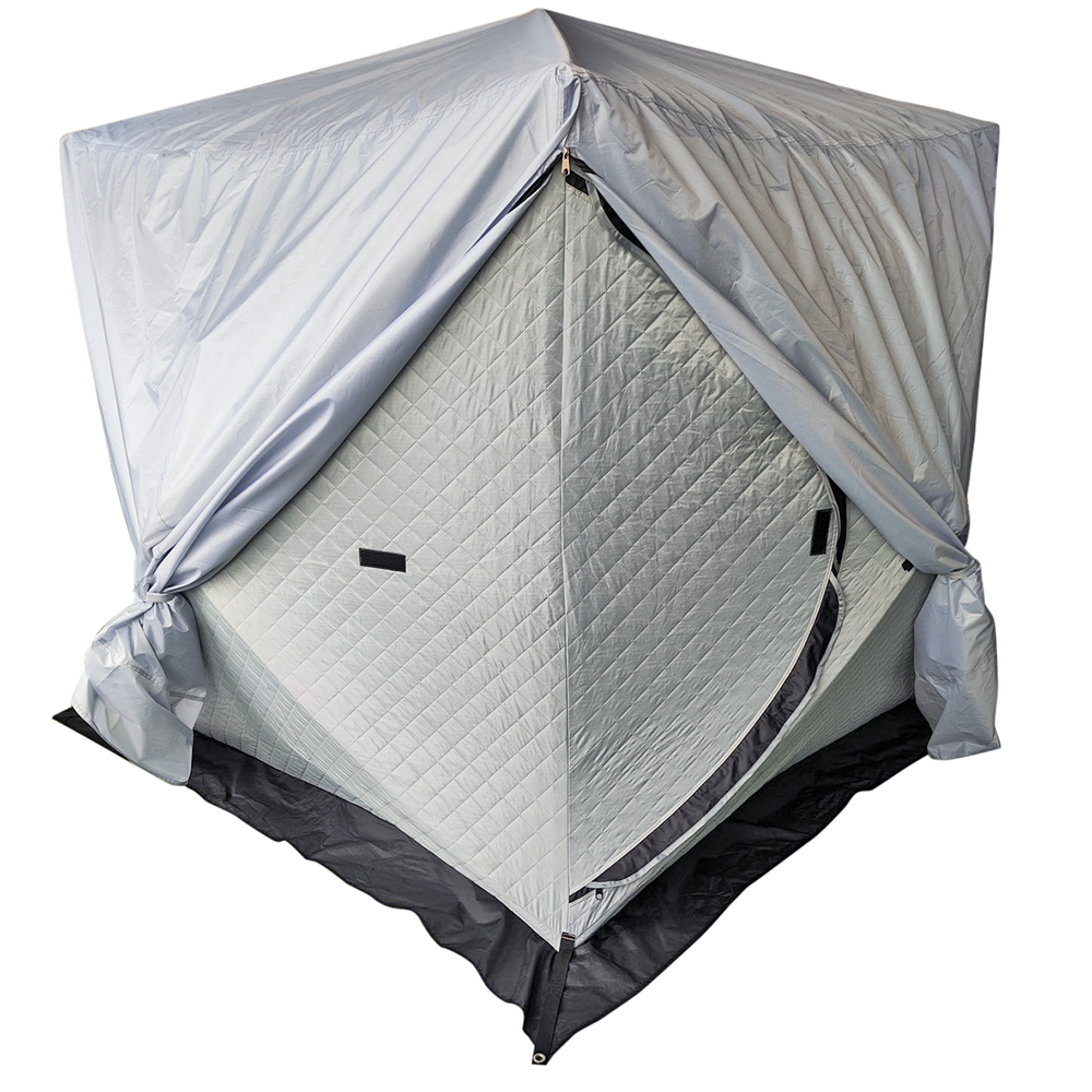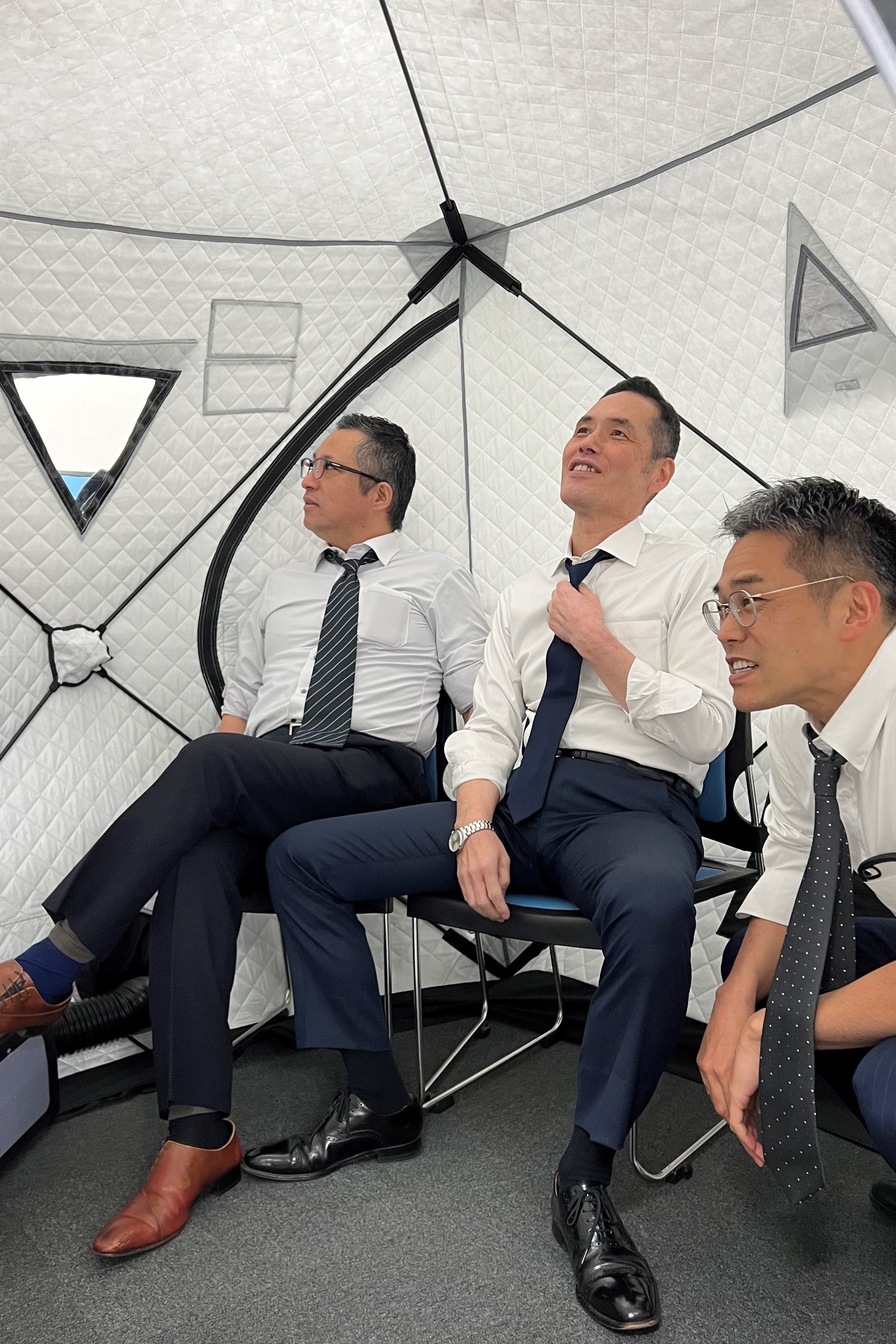 移動式エアコン(別売)を利用することで、外気温35℃時にテント内は約20℃に。※弊社独自調査