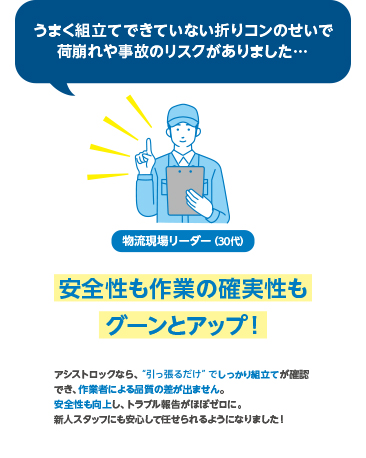 自動折りコン組立て機や手作業での組立ての場合、短側部のかんごう不足や他機器との衝突等による転倒の恐れ、再度組立ての作業負担が増加します。再度組立てになると約60秒かかります!