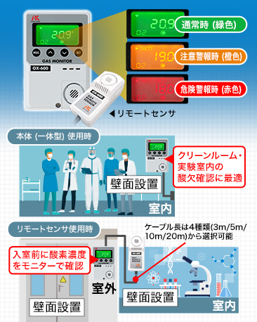 | ③ OX-600 | クリーンルームや実験室などに簡易設置可能な定置型酸素濃度計です。 リモートセンサ使用の場合、離れた場所の酸素濃度をモニタリング可能となります。 3色(緑・橙・赤)に光る大きくて見やすいLCD画面表示です。 |