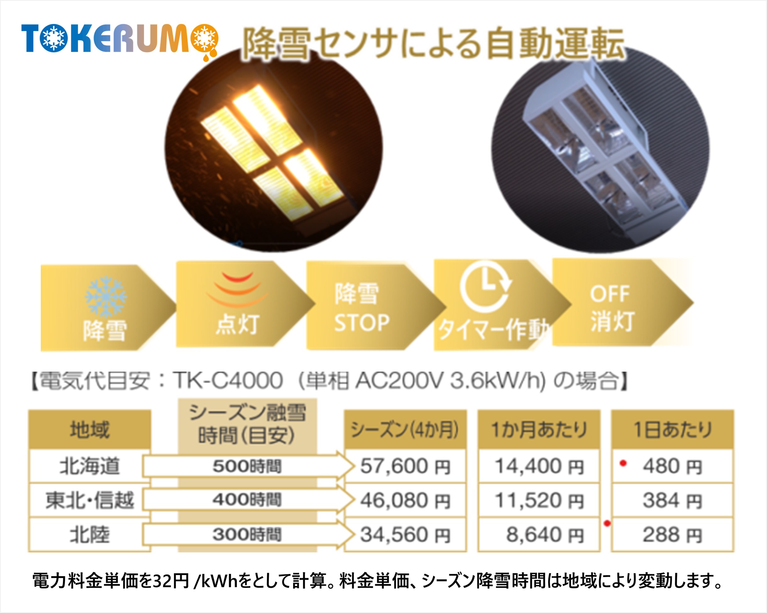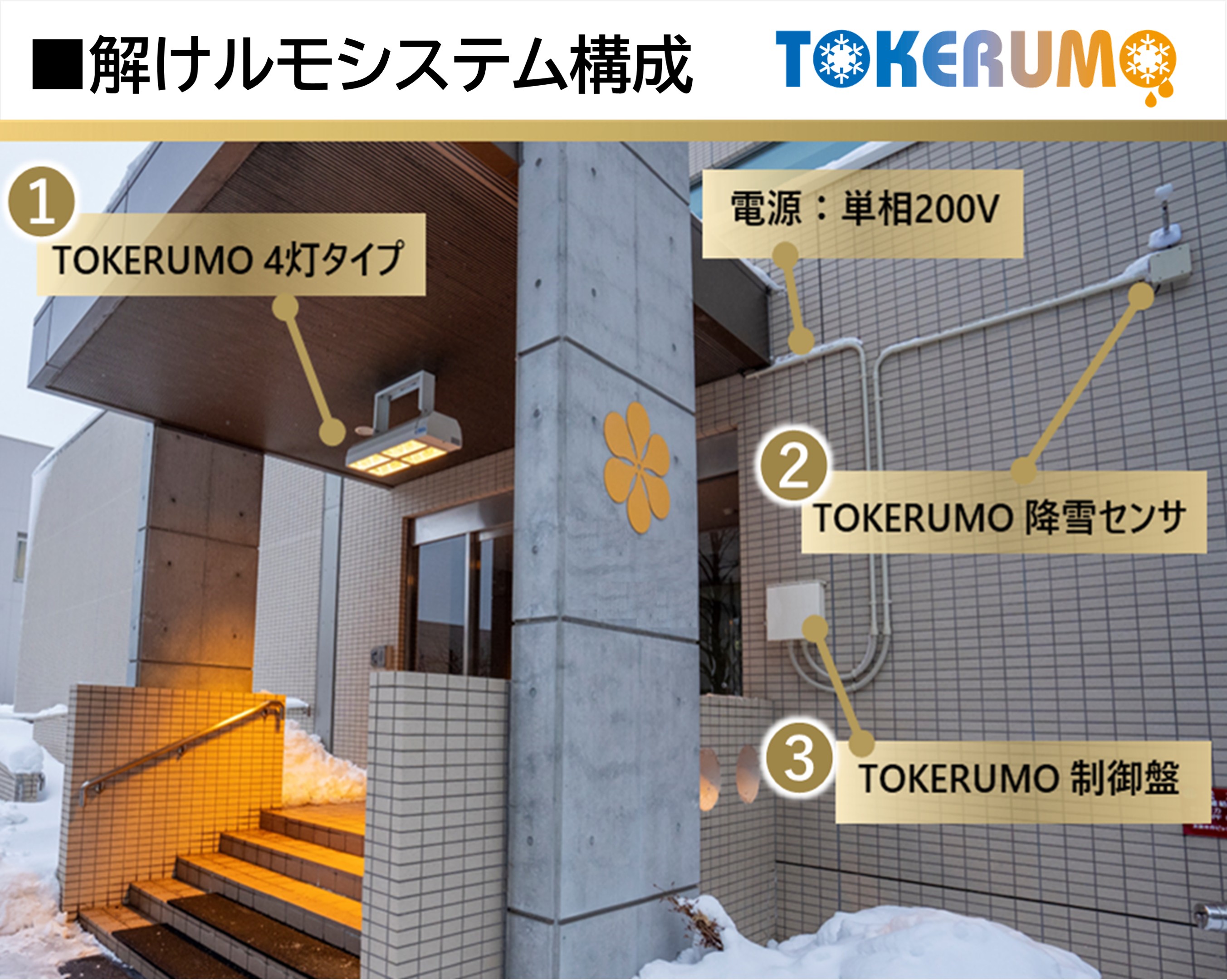 | システム構成 | 専用の降雪センサと制御盤(別売)をセットでご使用いただくことにより、24時間自動融雪(降雪時のみの自動点灯)を行います。設置台数に応じて必要アンペア数の制御盤の組み合わせが可能です。 |