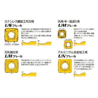 • UNブレーカ(アルミニウム合金加工用):切れ味を重視したブレーカ形状と外周研摩によるシャープエッジにより、優れた切りくず処理を実現します。