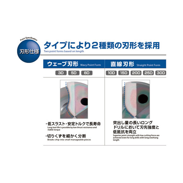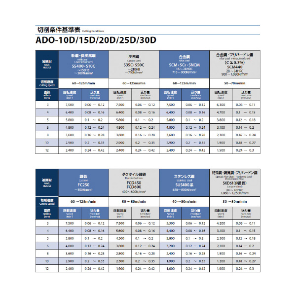 • 被削材:低炭素鋼(C~0.25%)/中炭素鋼(C0.25%~0.45%)/高炭素鋼(C0.45%~)/合金鋼/調質鋼(~35HRC)/ステンレス鋼(~35HRC)/工具鋼/鋳鉄/ダクタイル鋳鉄