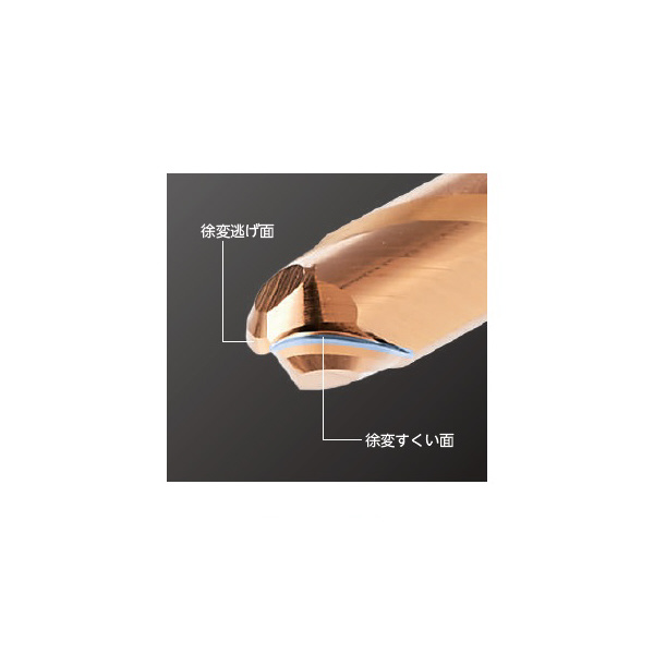 • 強バックテーパで低抵抗:点切削によりびびりを抑制、仕上げ面品位向上、倒れを低減。