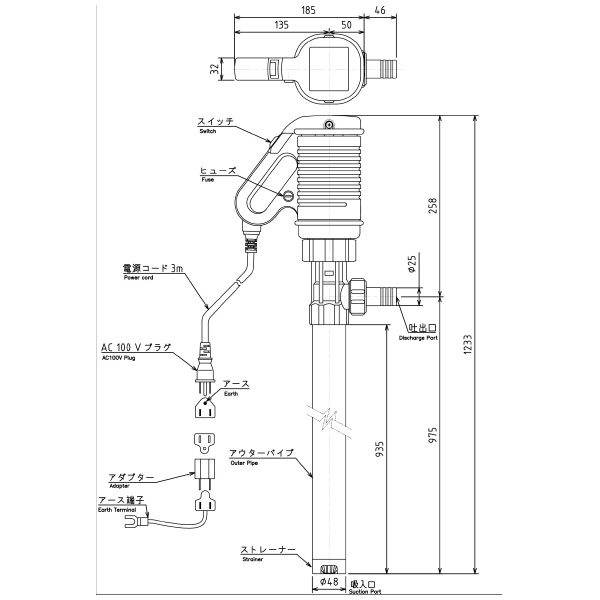 • 材質:ポリプロピレンPP(アウターパイプ/インナーパイプ/羽根車)/C276(シャフト)/四フッ化エチレン樹脂PTFE(メタル)/フッ素FPM(Oリング)