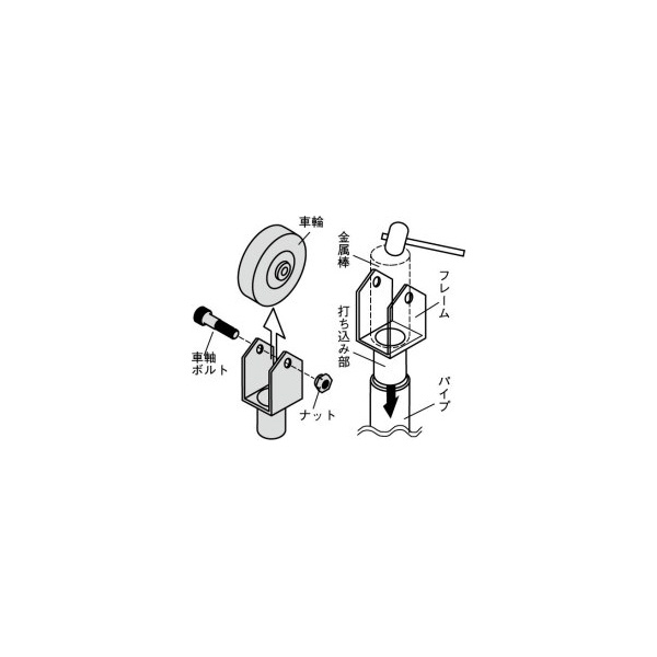 • SGK(B)固定キャスターの取付方法:(1)車軸ボルトを外し、車輪を本体フレームから取り外します。(2)フレーム内側に金属棒等をあて、パイプに垂直になるようハンマーでしっかり打ち込んでください。(3)車輪を元のようにボルト・ナットで取り付けてください。この時、車輪がしっかり回転するようナットの締め付けを調整しながらセットしてください。(4)パイプに取り付け後は、必ずビス(タッピングビス)止めしてください。